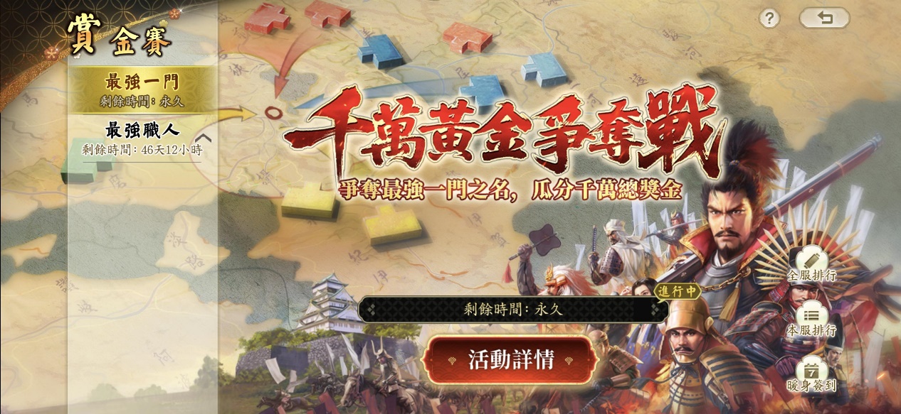 戰國舞臺已經拉開序幕,「千萬黃金爭奪戰」戰局全面升溫,雅英的甜美鼓勵更為遊戲和賽事注入全新的活力。現在登入創角,隨著遊戲的腳步一起回到戰國時代,參與這場規模浩大的頂級賽事,瓜分價值千萬台幣,贏取實體黃金大獎。
