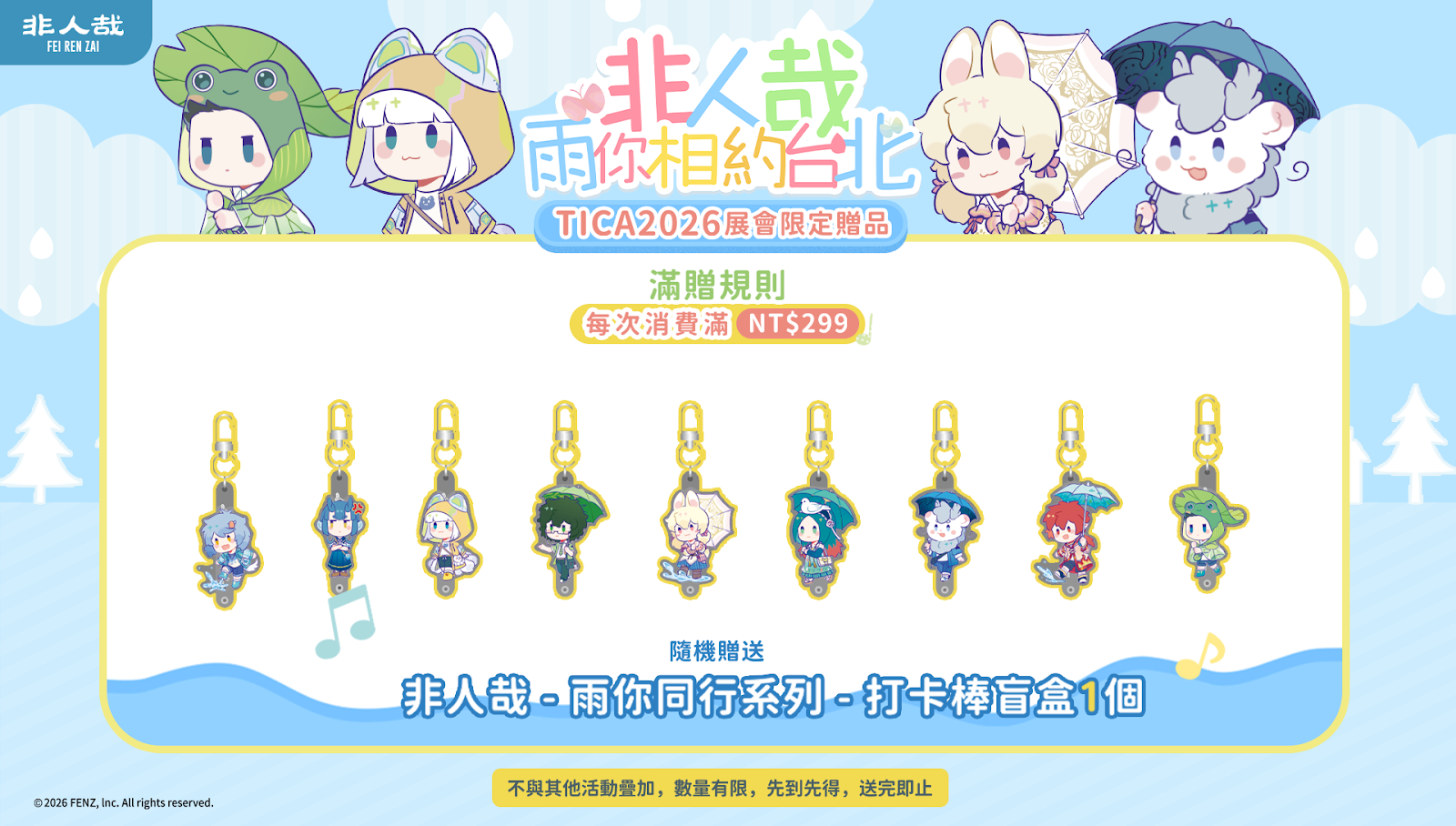 Coser 加碼賞:若粉絲身著《非人哉》 角色 Cosplay 服裝來到攤位並完成關注任務,將額外加碼贈送「非人哉-雨你同行系列-打卡棒盲盒」乙個,同樣每天限量,送完即止!